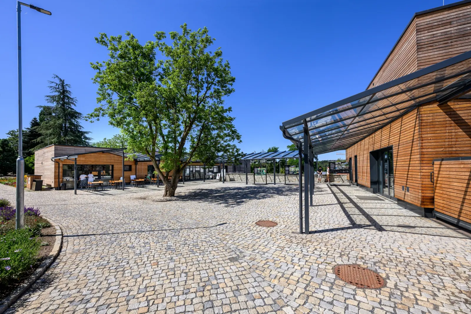 Centrum je rozdělené na 2 samostatné domy, aby hmotově navázaly na charakter a měřítko okolní zástavby. Na objektech i okolních plochách jsou použity přírodní materiály – dřevo (sibiřský modřín), kámen, sklo, hliník, nerez.