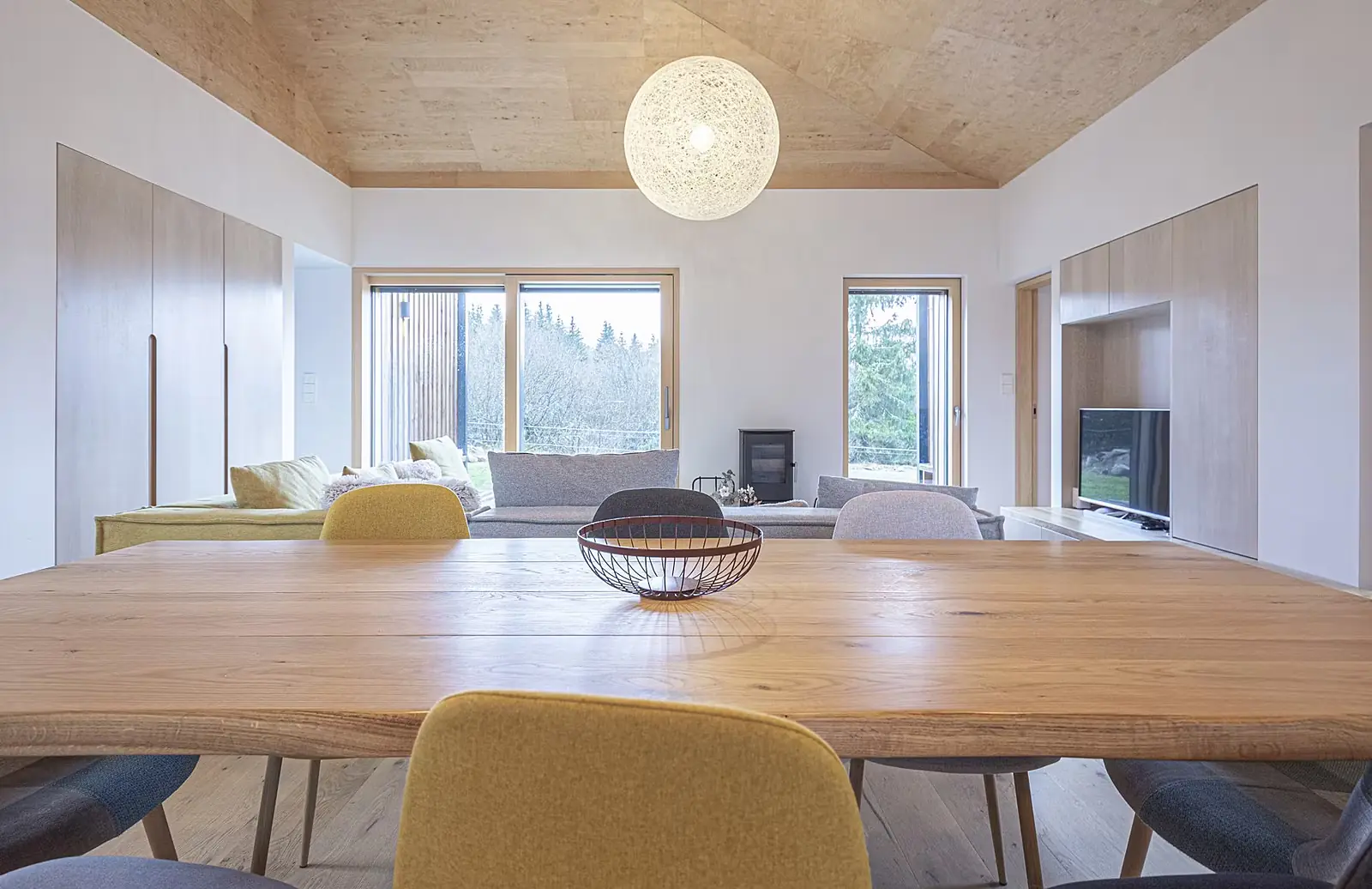 Interiér je založen na hřejivých tónech dřeva, které architekti doplnili o barevné akcenty látek použité na čalounění. Překližkový strop podtrhuje atypické tvarosloví modulů a dává jednotlivým místnostem nezaměnitelný charakter.