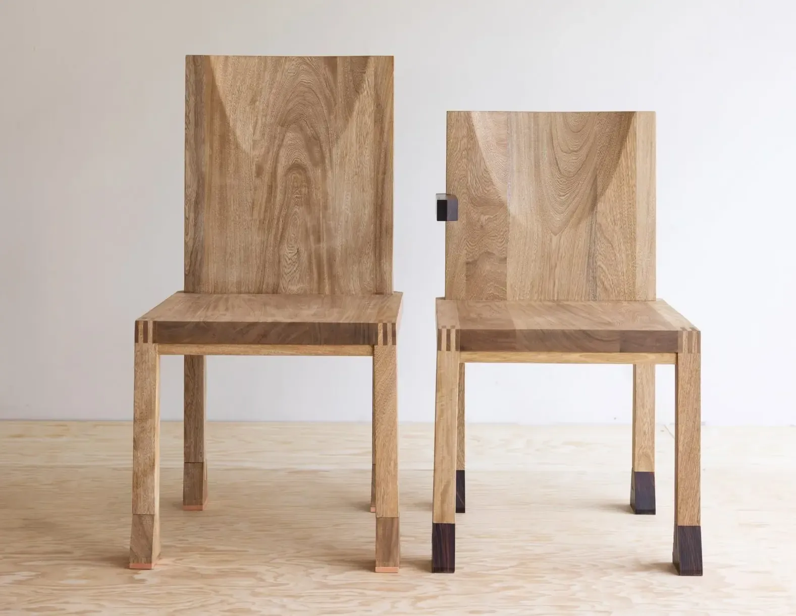 Židle se skládají z jednoduchých dřevěných prvků Rosa Morada s hranatými nohami, které vykazují elegantní rybinový spoj, vyrobený tradičními truhlářskými technikami.