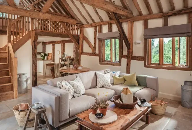 Původní dubové trámy vytváří jedinečné kulisy pro jednoduchý ale po všech stránkách pohodlný interiér.