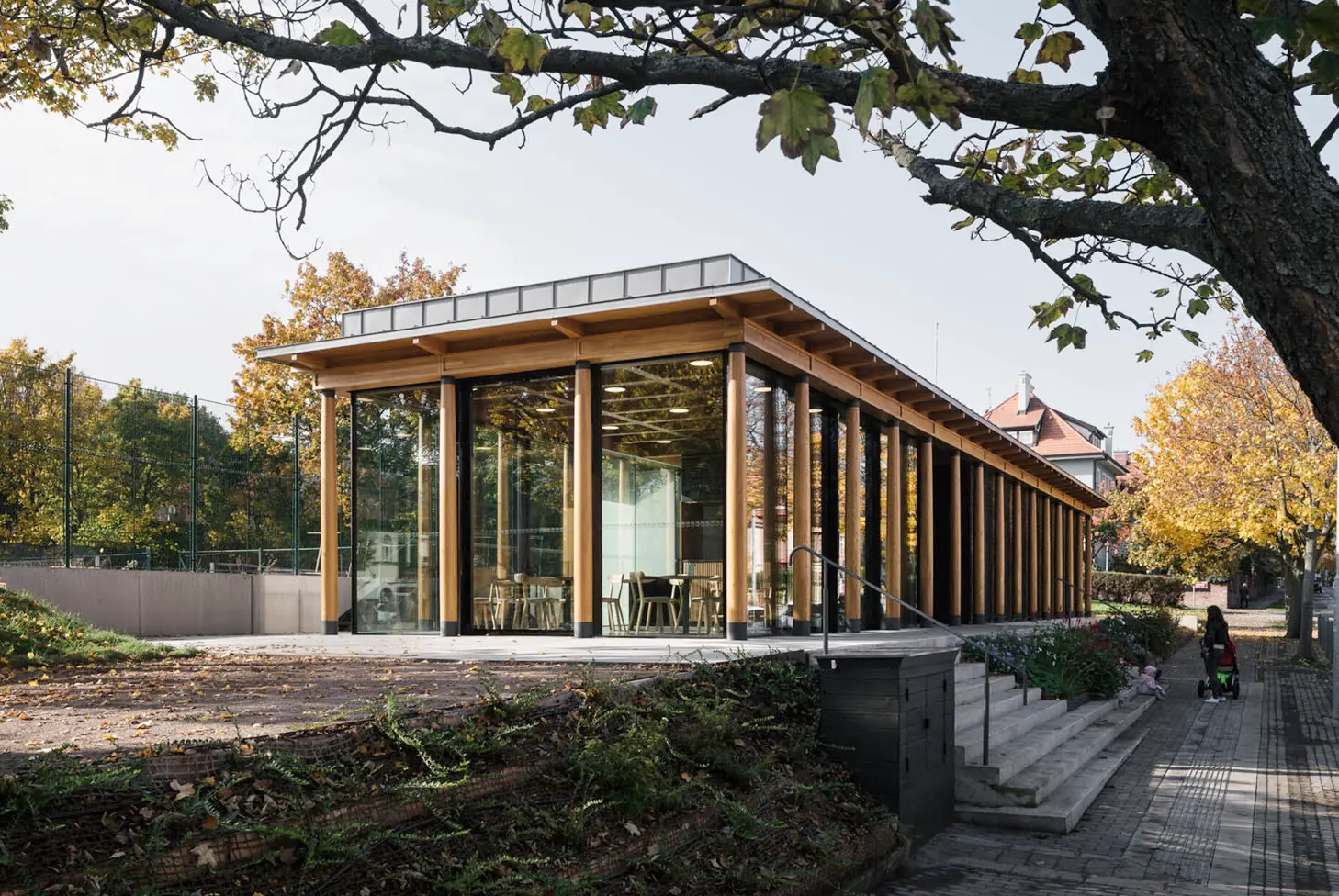 V samém středu pražské vilové čtvrti Ořechovka stojí nová stavba. Možná byste čekali novou nebo zrekonstruovanou původní vilu, ale není tomu tak. V severní části Macharova náměstí vyrostla nová jednopodlažní budova. Jmenuje se Beseda a slouží jako zázemí tamního tenisového klubu.