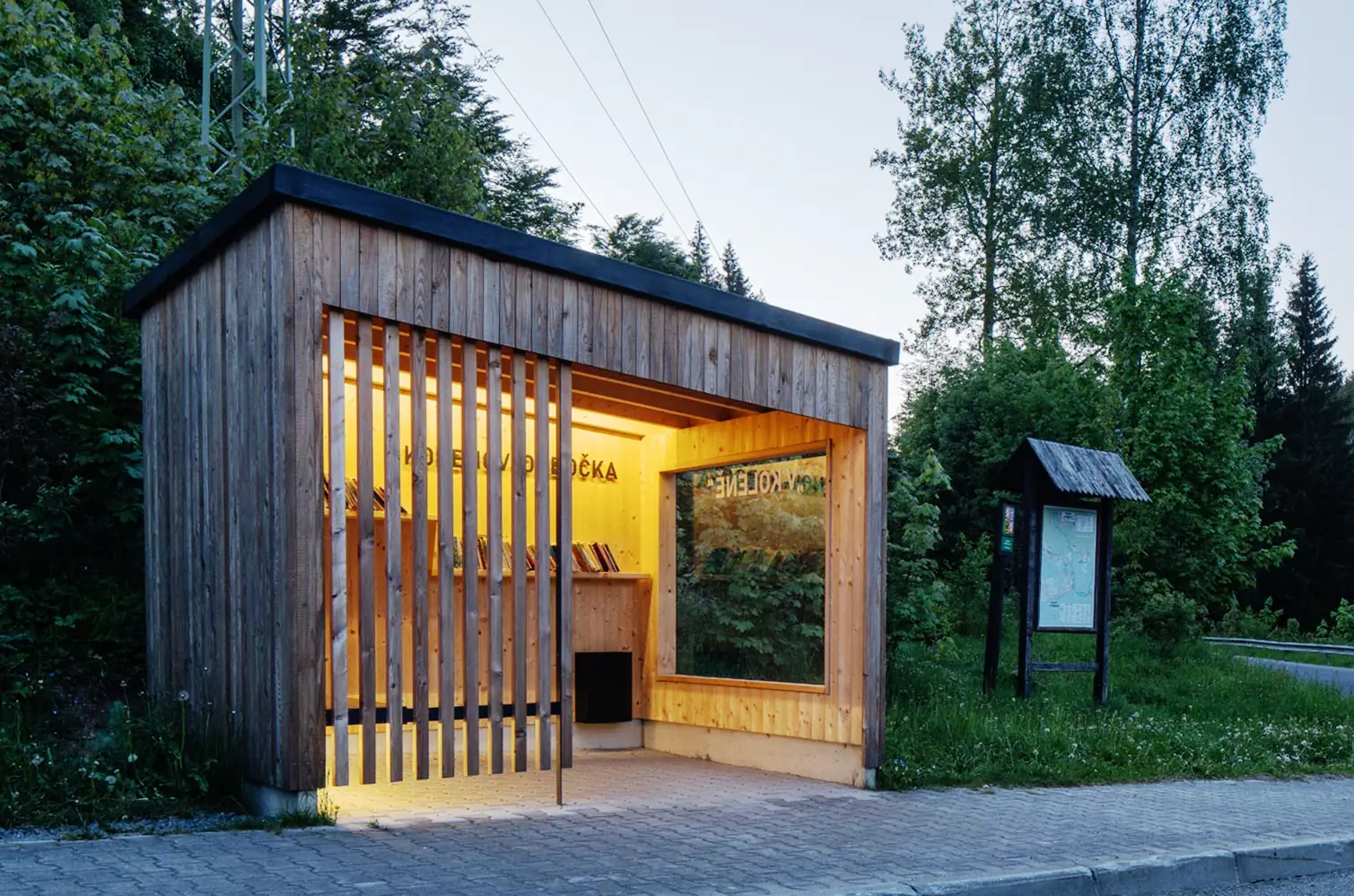Drobná stavba postavená ze dřeva má velké skleněné okno, plochou střechu a uvnitř osvětlení na police s knihami. Čekající cestující si tak může chvíli čekání zkrátit četbou.