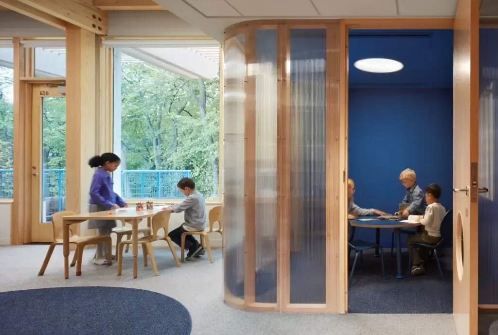 Naším cílem bylo vytvořit příjemné a radostné vzdělávací prostředí, které podporuje spojení mezi dětmi a přírodou. Chtěli jsme vyjádřit dřevěnou konstrukci jako rámec pro tyto vztahy.