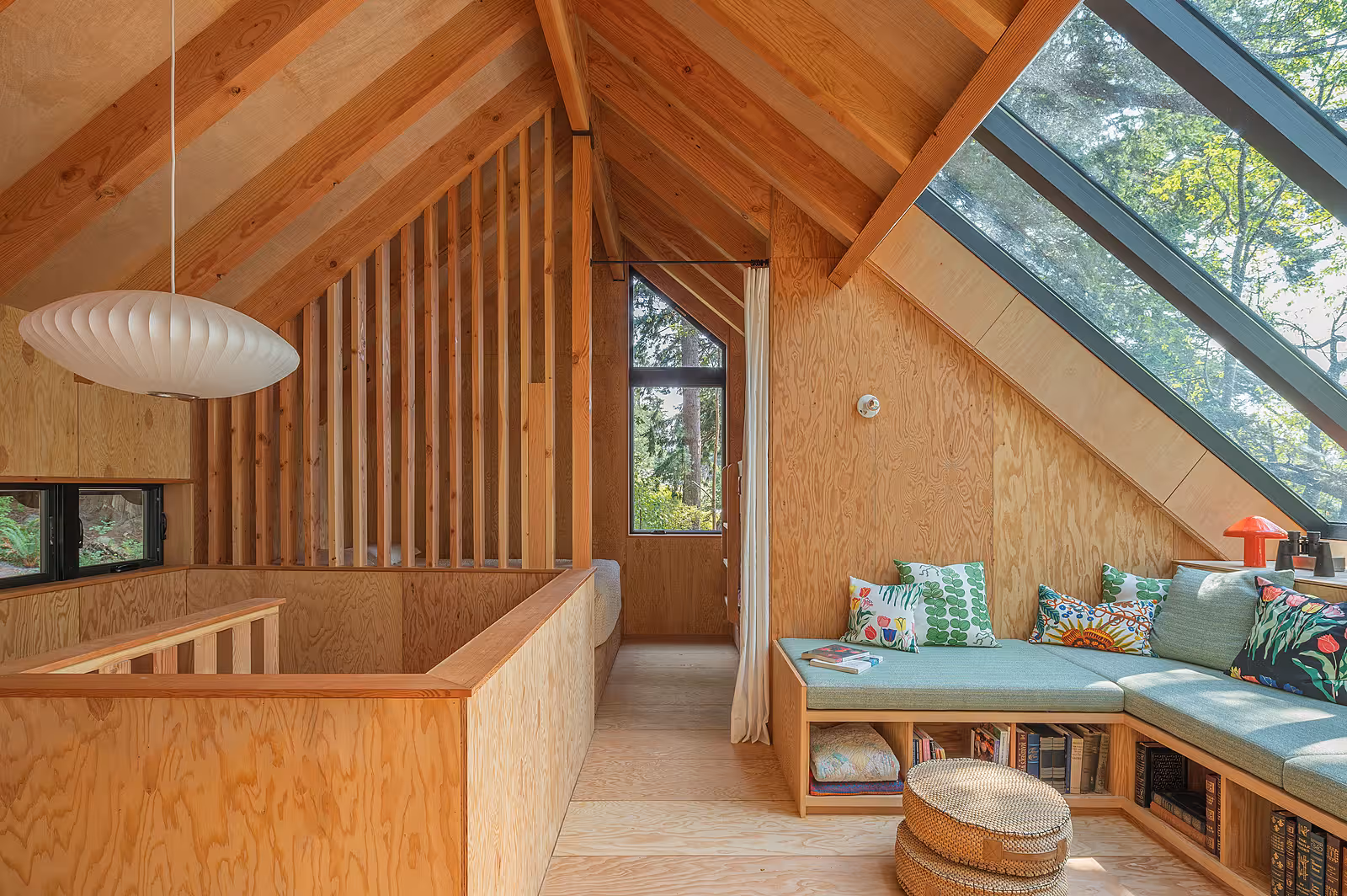 Dvoupodlažní dřevostavba vyrostla v lese, jen kousek od stoletého srubu. Slouží jako doplňkové ubytování pro rodinu a přátele, kteří zde tráví prázdniny. Starý srub je přitom hlavní základnou, chata jen klidnou noclehárnou na pobřeží Rybářské zátoky, ve státě Washington.