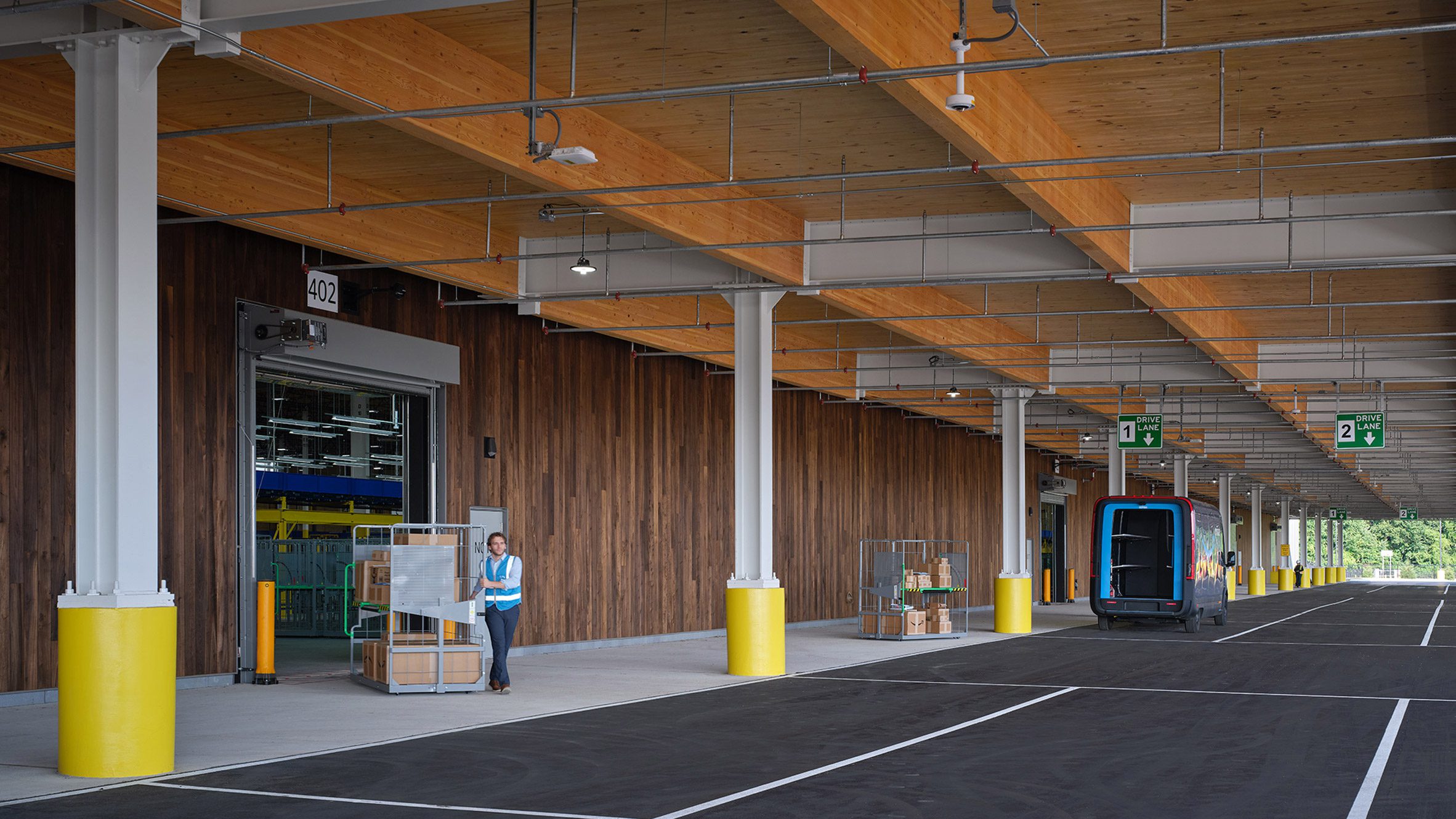 Amazon has completed a mass timber warehouse in Indiana, which the company says will be used as a testbed for “over 40 sustainability strategies”