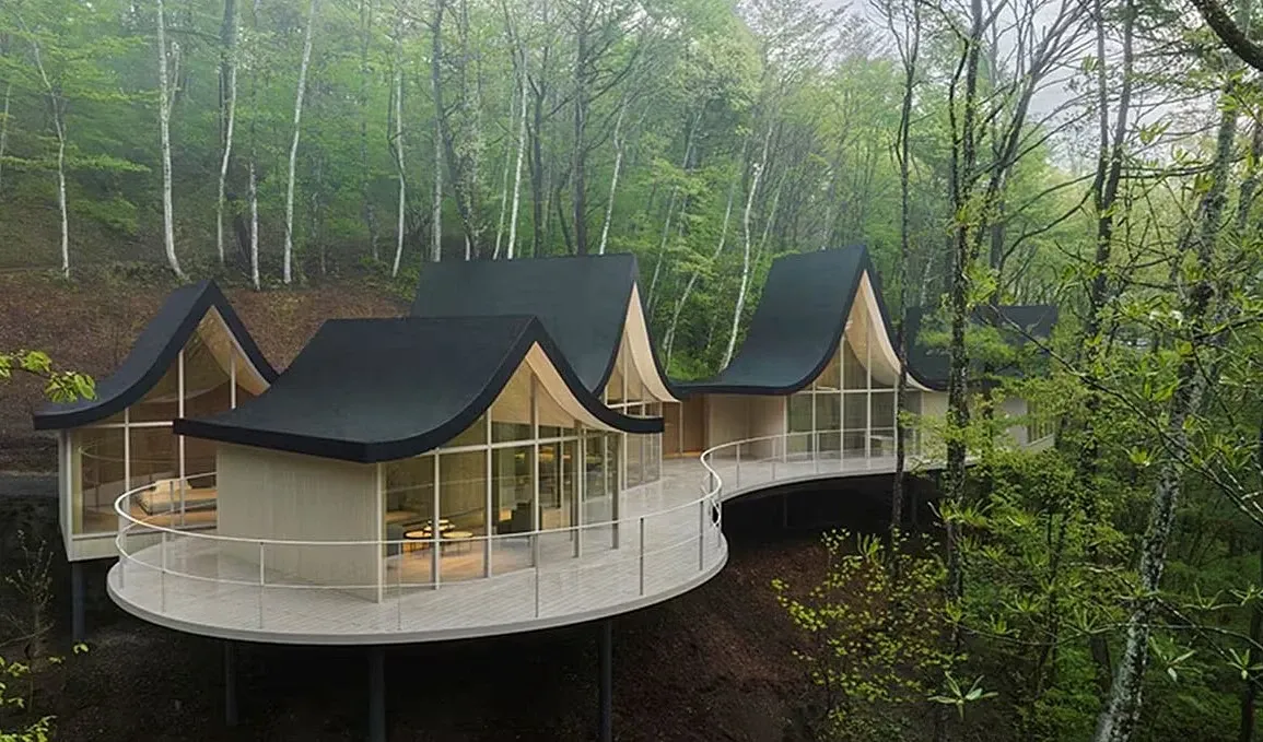 Dům Hand in Hand od designového studia Nendo najdete v kopcích Karuizawy ve středním Japonsku. Tvoří jej šest propojených chat s jedinečným výhledem na horu Asama.