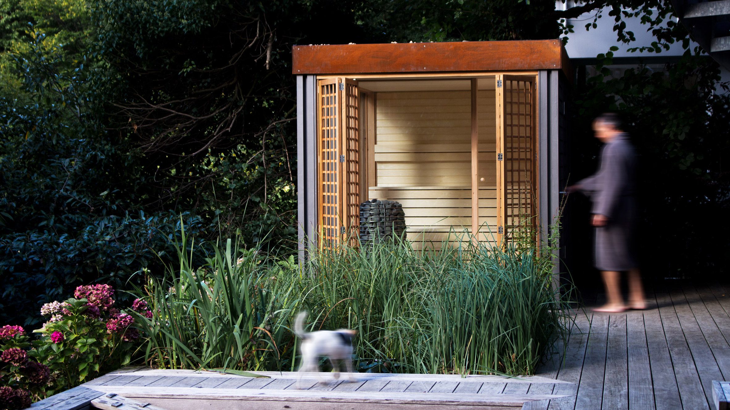 Designer Malte Schütt has created a modular wooden sauna with a gridded facade and a planted roof that connects it to its green, garden setting.