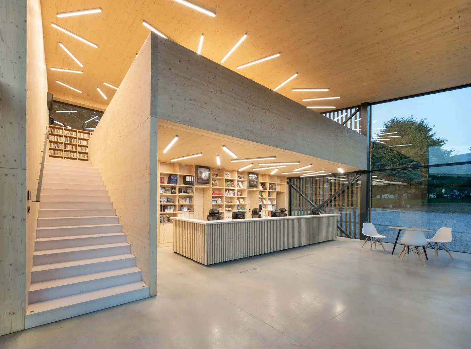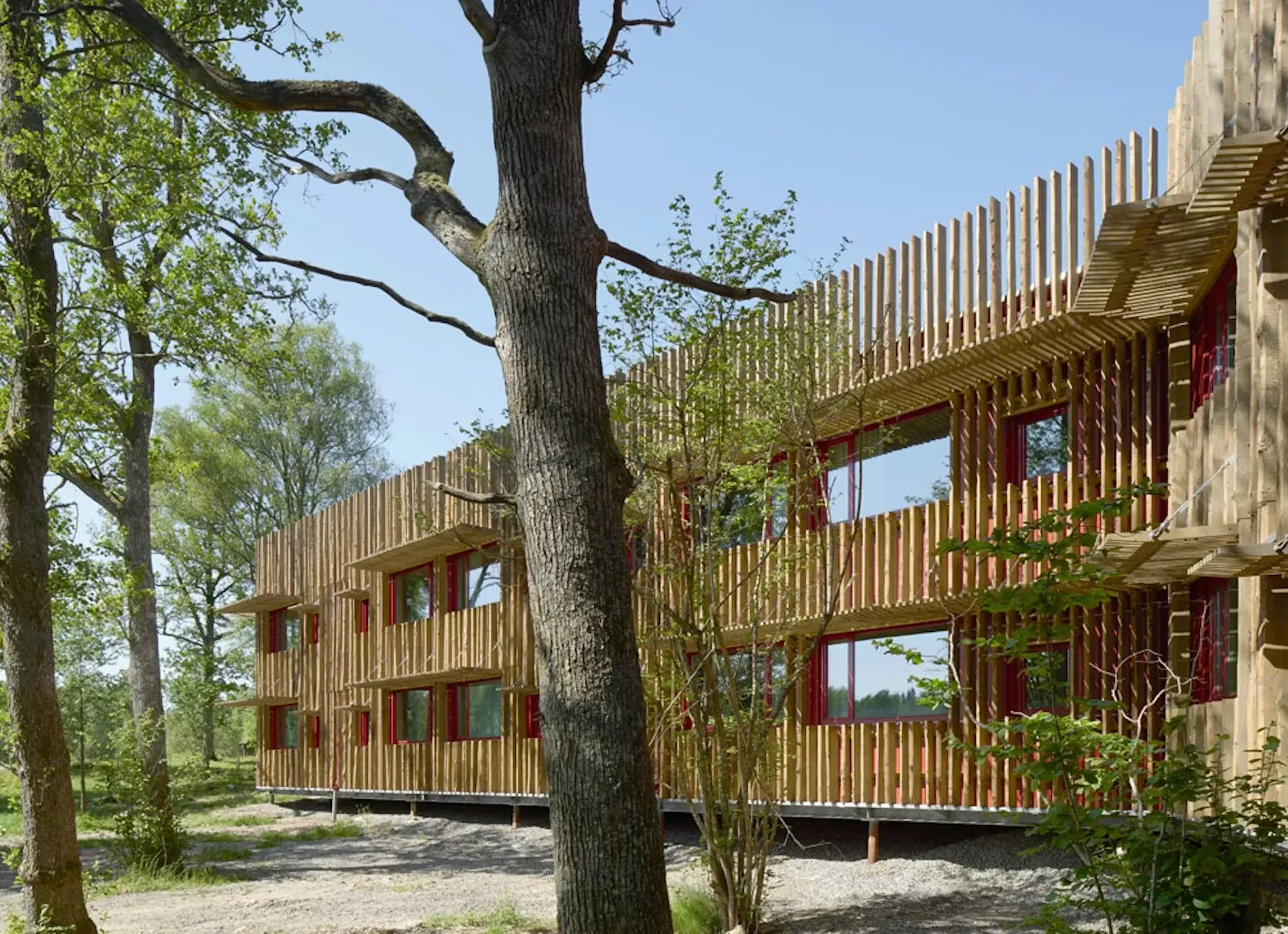 Budova je s respektem ponořena do okolní přírody s materiály a tlumenými barvami z lesní palety, a to jak v exteriéru, tak i v interiéru. Fasáda je otočena v různých úhlech, což poskytuje šest různých pohledů.