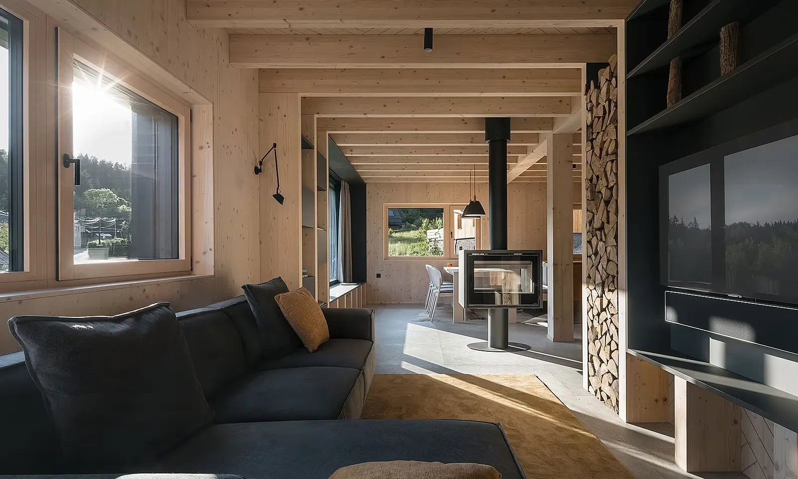 Obě obytná podlaží byla stavěna suchou metodou z dřevěných sendvičových panelů, na které v interiéru přibyly na zdech i stropech pohledové biodesky.