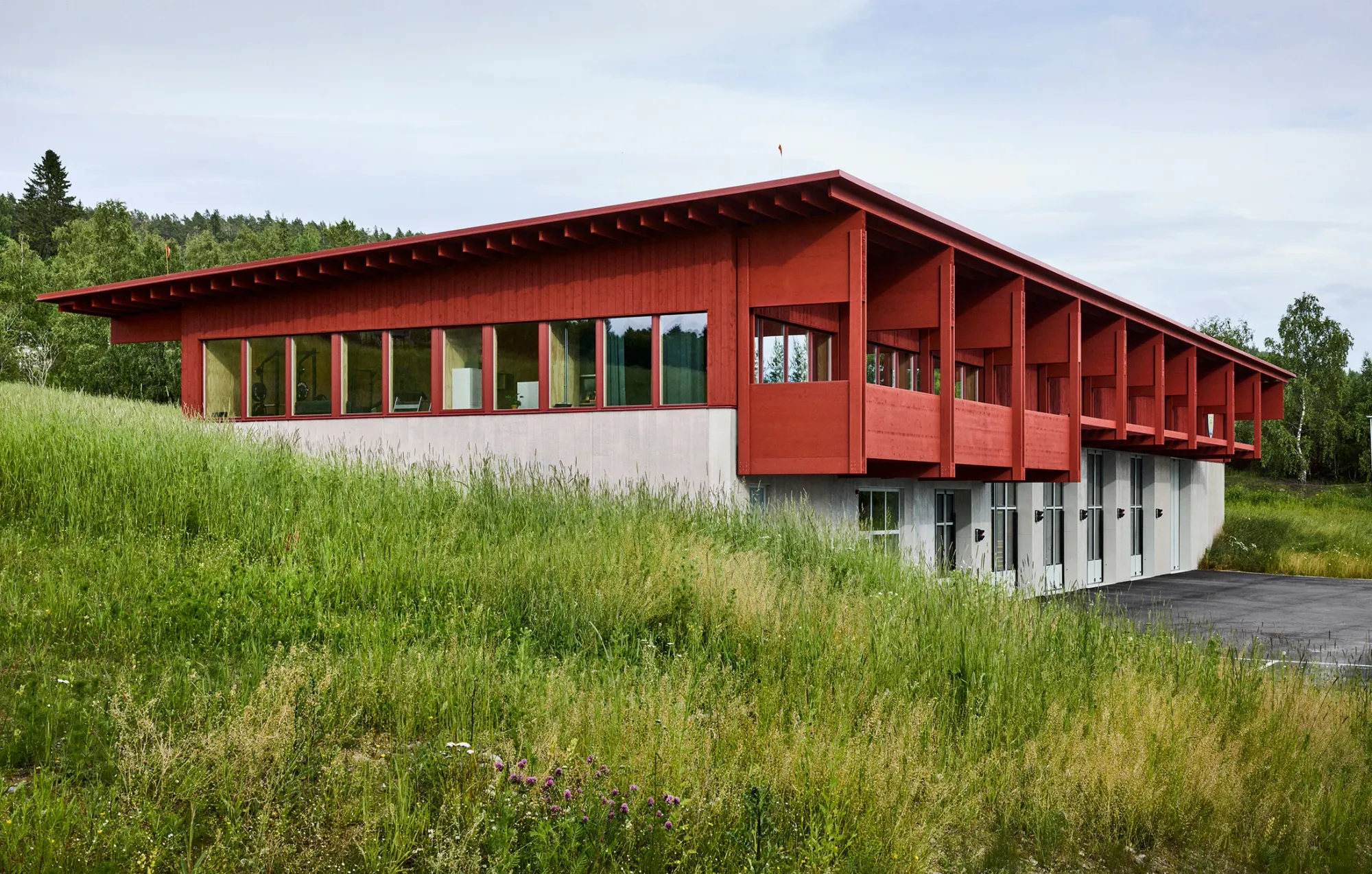 Stockholmské studio Kod Arkitekter vytvořilo ve Švédsku hasičskou stanici , kterou obložilo zářivě červeně mořeným dřevem , aby se stala místní dominantou.