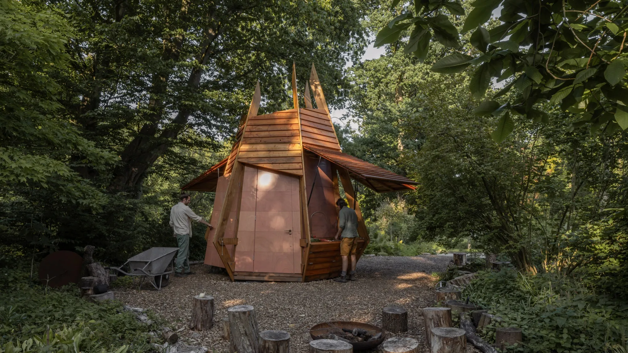 V rámci konstrukce ve tvaru lusku se nachází úložný prostor na nářadí, dřez, kompostovatelná toaleta a lavice. Všechny tyto funkce jsou skryty za dřevěnými panely, které se otevírají nahoru a slouží zároveň jako stříšky pro úkryt na malé mýtině.