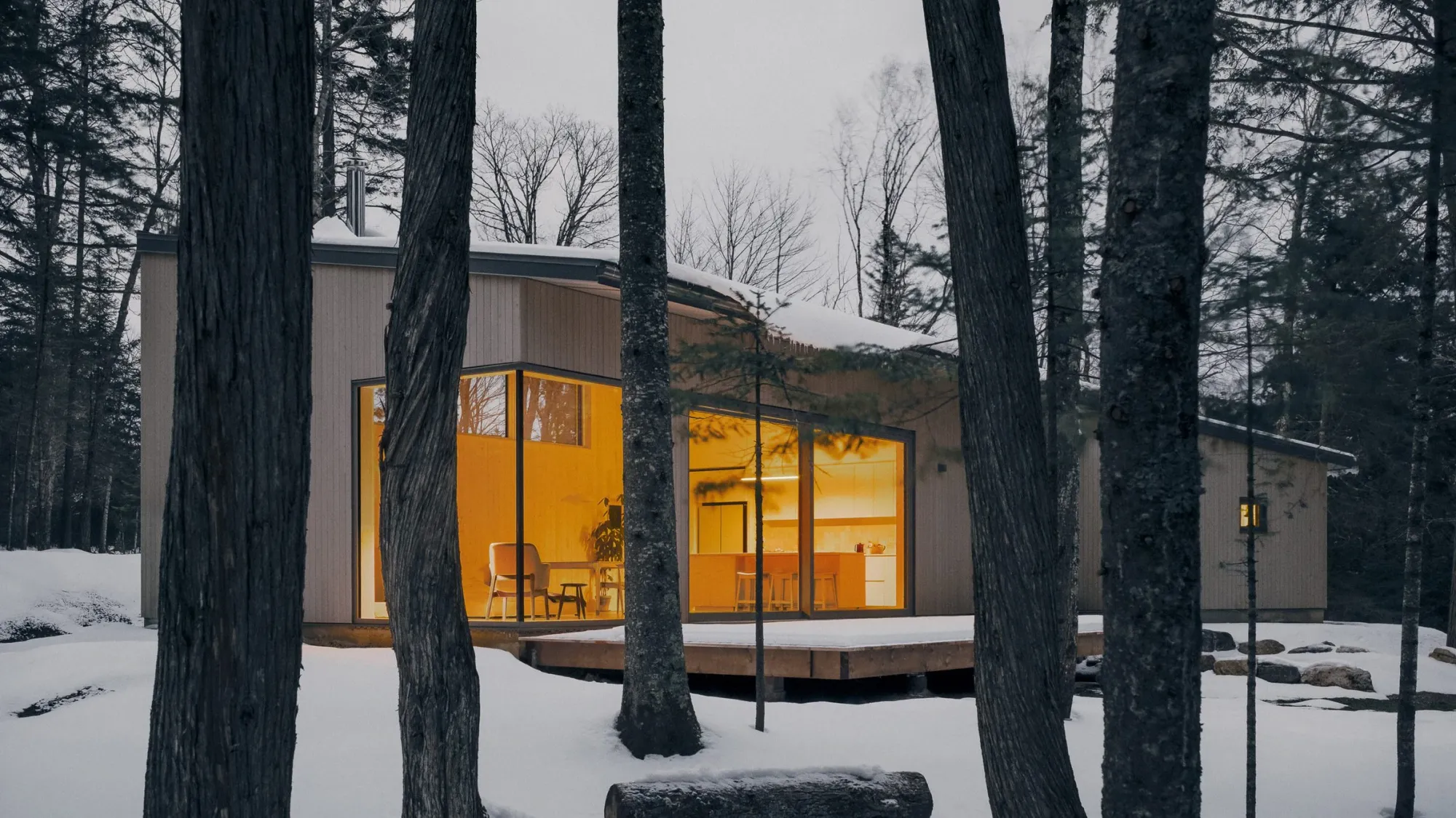 Dřevěné povrchy dodávají teplo a texturu, v kontrastu s precizními kovovými detaily, které posilují minimalistický charakter konstrukce. Čisté linie, tlumená barevná paleta a přírodní povrchové úpravy dodávají chatkám nadčasovou a autentickou atmosféru.