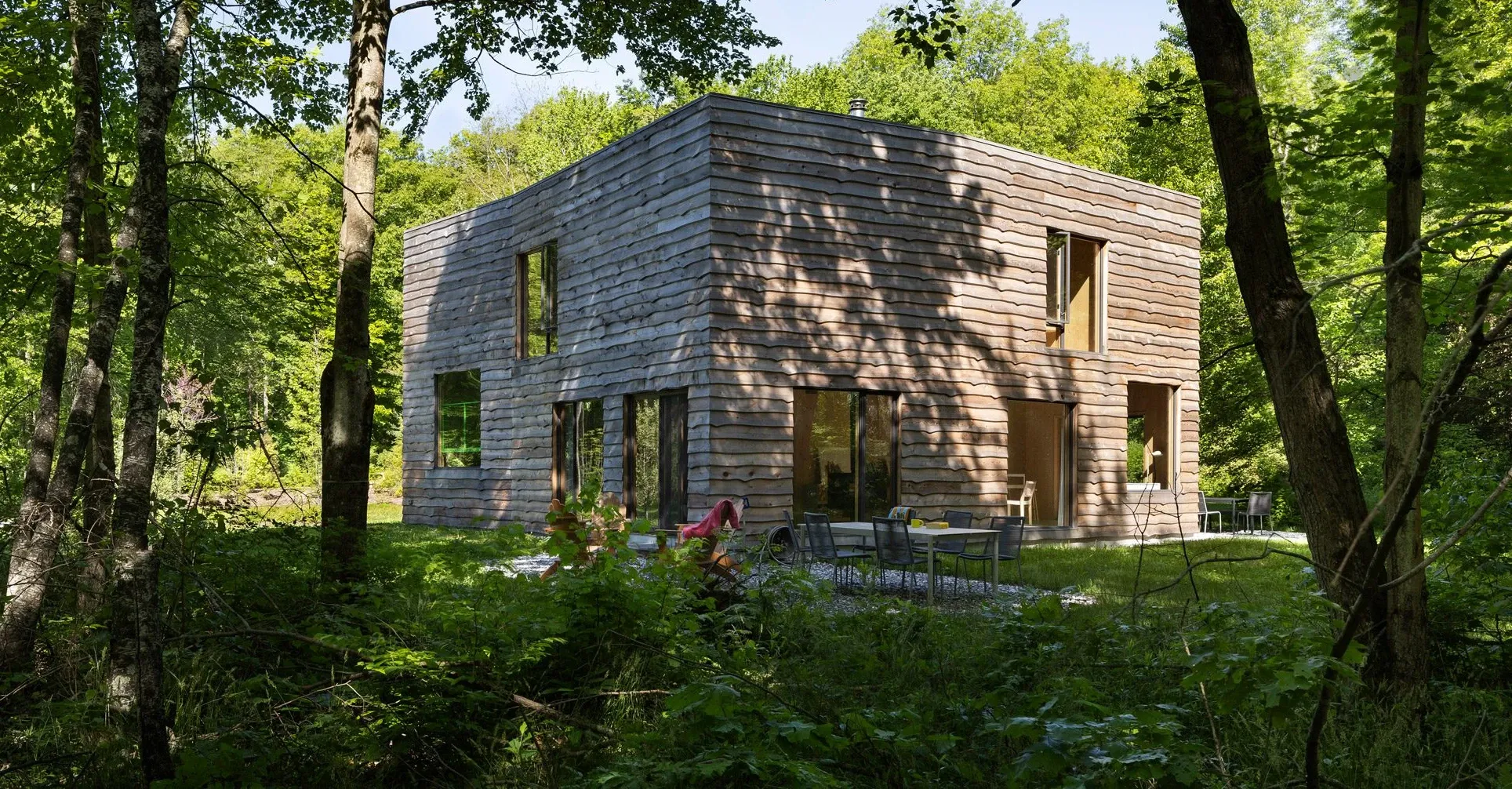 Dřevěná konstrukce z masivního dřeva a obklady z cedrového dřeva s živými hranami patří mezi prvky, které použili zakladatelé brooklynského studia nArchitects k vytvoření vlastního domu u jezera v údolí řeky Hudson.